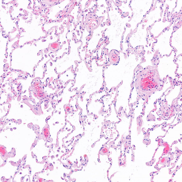 Gesundes Lungengewebe: Mikroskopische Aufnahme einer gesunden Lunge. Die weissen Bereiche sind Lufträume, dazwischen liegen feine Gewebestrukturen, in denen der Gasaustausch stattfindet.