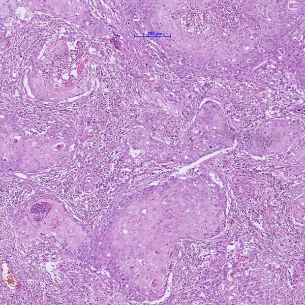 Lungentumor: Mikroskopische Aufnahme einer Gewebeprobe aus einem Lungentumor. Die vielen dicht beieinanderliegenden atypischen Zellen zeigen, dass es sich um ein Karzinom handelt.